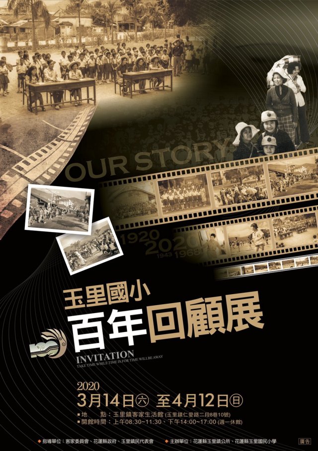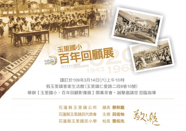 玉里國小百年校慶系列活動之影像回顧展,訂於109年3月14日(六),上午10時於玉里客家生活館舉行開幕茶會,茶會後將開放民眾參觀,展出日期至109年4月12日(日),展出時間為上午08:30~11:30、下午14:00~17:00(週一休館),本次展出的內容為玉里國小百年來的學生活動相片及校園美景,玉里鎮長蔡秋龍及玉里國小校長張佑先校長偕全校師生歡迎校友及鎮民們共襄盛舉,一同見證玉里國小的百年風華。