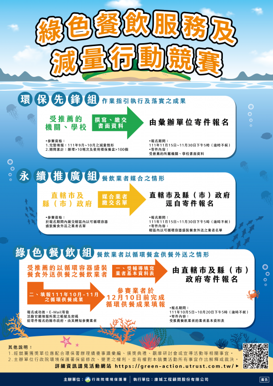 一、依據「行政機關、學校減少使用免洗餐具及包裝飲用水作業指引」及「綠色餐飲服務及減量行動競賽」規定辦理。 |