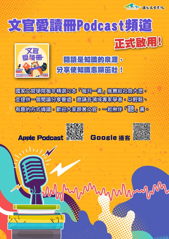 國家文官學院為擴大公務人員專書閱讀多元學習管道,成立「文官愛讀冊」Podcast頻道,請同仁多加利用。