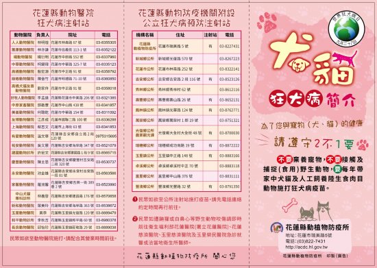 狂犬病防疫宣導音檔、海報及宣導單張等資料,請各校至花蓮縣動植物防疫所網站https://acdc.hl.gov.tw/cp.aspx?n=34687 下載或索取,後續也會陸續製作越南語、泰語及印尼語等語言版本。 |