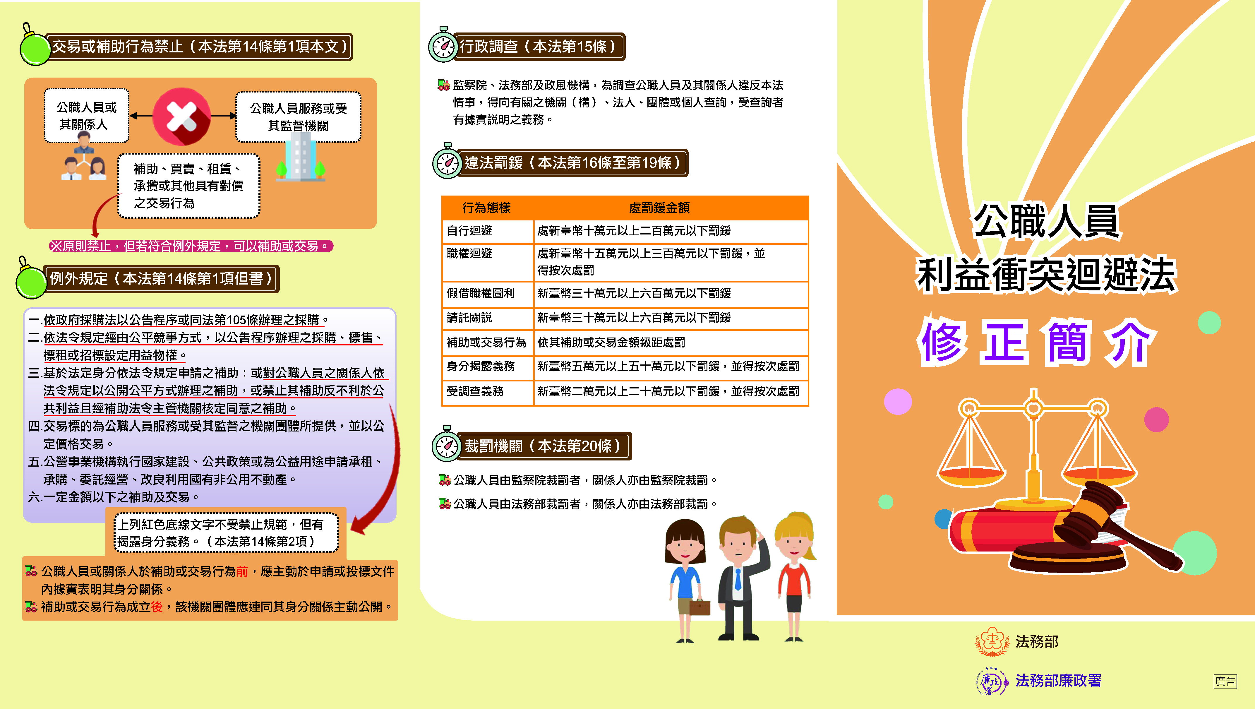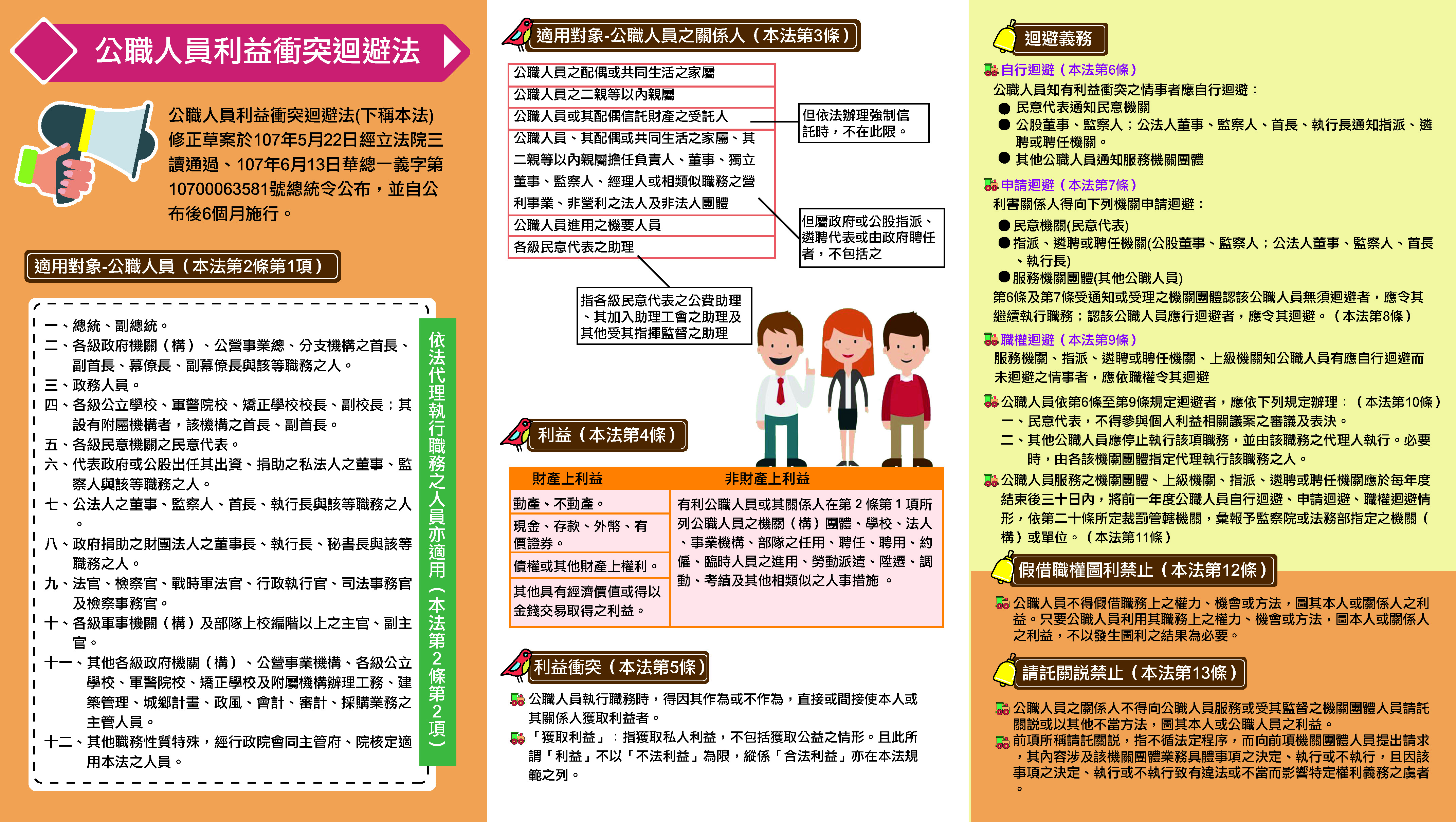 | 二、 | 公職人員利益衝突迴避法(下稱本法)修正草案於107年6月13日華總一義字第10700063581號總統令公布,並將自公布後6個月施行。為使本法適用對象及各機關政風人員能充分瞭解本法修正內容,法務部爰透過多元管道進行宣導,編製宣導摺頁供各機關參考運用。 |